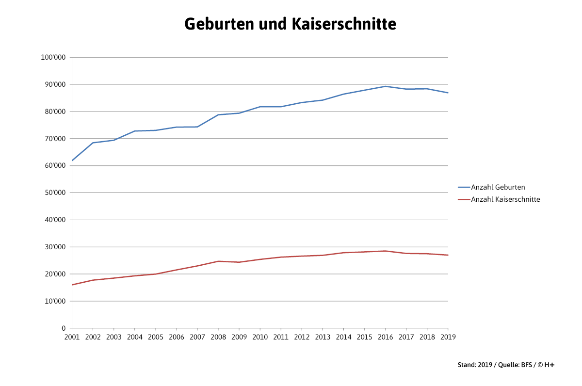 2019 verzeichneten die Spitäler und Kliniken rund 86’900 Geburten und 27’000 Kaiserschnitte. Damit kamen 31,1% aller Neugeborenen im Spital mittels Kaiserschnitts zur Welt. Noch 2001 kamen auf rund 62‘000 Spitalgeburten 16‘000 Kaiserschnitte, was einem Anteil von rund 26% entsprach. In der Folge haben sowohl die Zahl der Geburten als auch diejenige der Kaiserschnitte kontinuierlich zugenommen. Innerhalb von achtzehn Jahren stieg die Zahl der Geburten im Spital um 40%. Im gleichen Zeitraum nahm die Zahl der Kaiserschnitte um 69% zu.