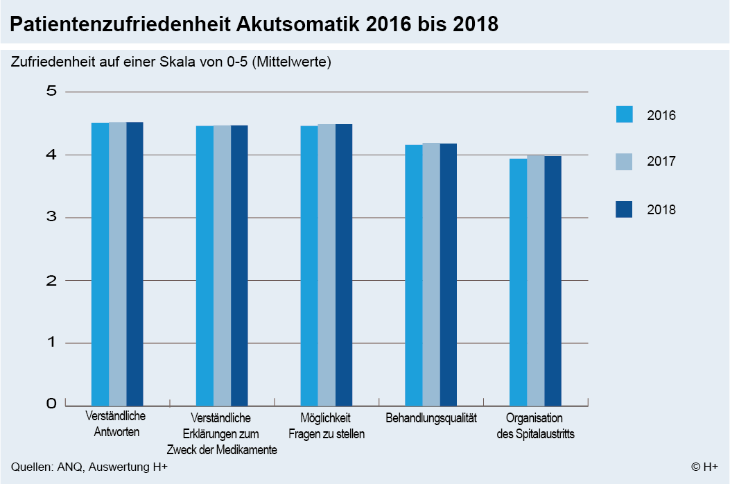 In der Befragung 2018 stellten die Patientinnen und Patienten den Spitälern wiederum ein besonders gutes Zeugnis aus bezüglich der Verständlichkeit von Antworten auf ihre Fragen (4.52) sowie von Informationen zum Zweck ihrer Medikamente, die sie zu Hause einnahmen (4.47, jeweils auf einer Skala von 0-5). Die Möglichkeit Fragen zu stellen, wurde im Schnitt mit 4.49 bewertet. Etwas weniger hoch ist der Zufriedenheitsgrad in Bezug auf die Organisation des Spitalaustritts (3.98) und die Behandlungsqualität (4.18). Die Spitalaufenthaltsdauer wurde von fast 90% der Umfrageteilnehmenden als genau richtig erachtet, ca. 10% empfanden den Aufenthalt zu lang oder zu kurz. Da die Frage zur Aufenthaltsdauer nur drei Antwortmöglichkeiten enthielt und für die Berechnung des Mittelwertes nicht geeignet ist, wird dieses Ergebnis in der Grafik nicht aufgeführt.