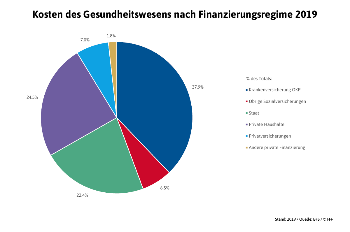 Grosse Bedeutung haben die privaten Haushalte. Sie steuern CHF 20,1 Mrd. aus eigener Tasche bei, was einem Anteil von 24,5% entspricht. Die private Zusatzversicherung sowie andere Private tätigen gesamthaft CHF 7,2 Mrd. oder 8,8% der Zahlungen.