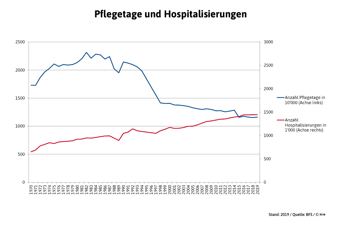 Hospitalisierungen und Pflegetage verlaufen seit 1982 in der Tendenz entgegengesetzt. Die Zahl der Hospitalisierungen nimmt tendenziell zu – von 0,65 Mio. (Stand 1970) auf 0,95 Mio. (1982), 1,10 Mio. (1998) und 1,45 Mio. (2019). Die Zunahme zwischen 1970 und 1982 betrug 46%, zwischen 1982 und 1998 stieg die Zahl der Hospitalisierungen um weitere 16% und zwischen 1998 und 2019 nochmal um 31%.
