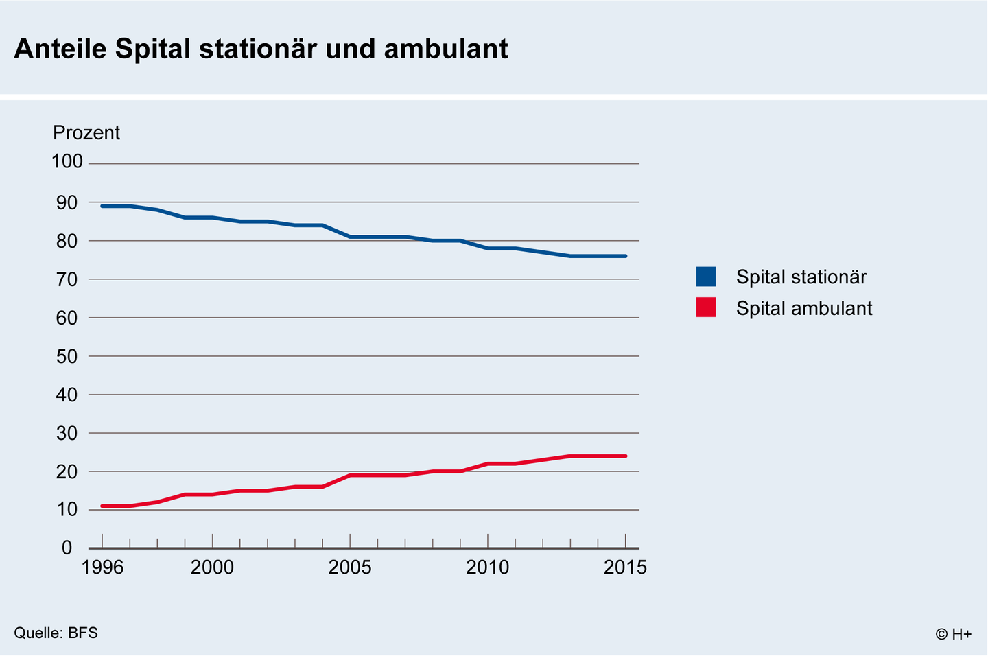 19 Jahre später, leisteten im 2015 die Spitäler ihre Behandlungen noch immer vorwiegend stationär, aber das Verhältnis zu den spitalambulanten Leistungen hatte sich auf 76:24 verkürzt. Von insgesamt 25,9 Mia. Franken entfielen 19,6 Mia. auf stationäre und 6,3 Mia. auf ambulante Leistungen.
