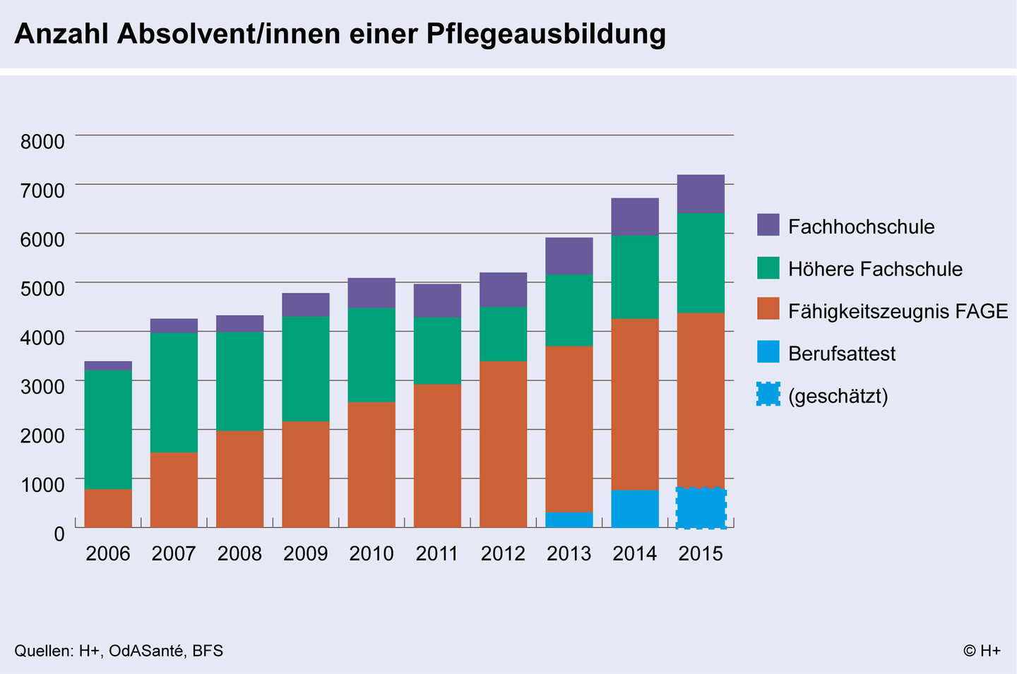 Die Zahl der Ausbildungsabschlüsse für Pflegeberufe hat sich zwischen 2006 und 2015 mehr als verdoppelt (+115%), von 3‘390 auf 7‘275. Die grösste Gruppe bildet die Fachperson Gesundheit (FAGE), die 2015 3‘650 Abschlüsse verzeichnete (50%). Dahinter Höheren Fachschule Pflege (HF) mit 2‘050 (28%), Assistentin Gesundheit und Soziales (AGS/ Berufsattest) mit – geschätzten – 790 (11%) und der Fachhochschule Pflege (FH) mit 785 (11%) Abschlüssen.