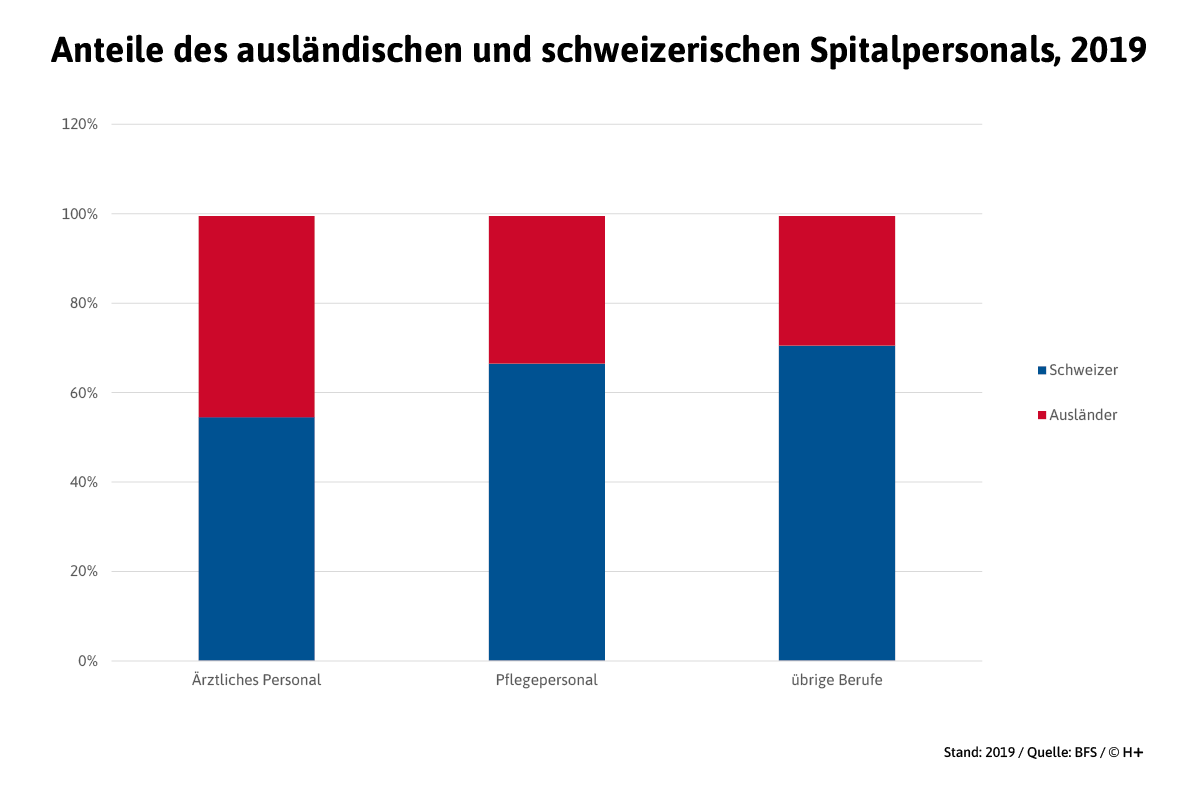 Am höchsten ist der Ausländeranteil bei den Ärzten mit 45%. Beim Pflegepersonal haben 33% eine ausländische Nationalität. Gross sind die Unterschiede in den Regionen. In der Westschweiz und im Tessin beträgt der Ausländeranteil des Spitalpersonals jeweils über 40%. Am tiefsten ist er in der Zentralschweiz mit 23% und im Espace Mittelland mit 25%.