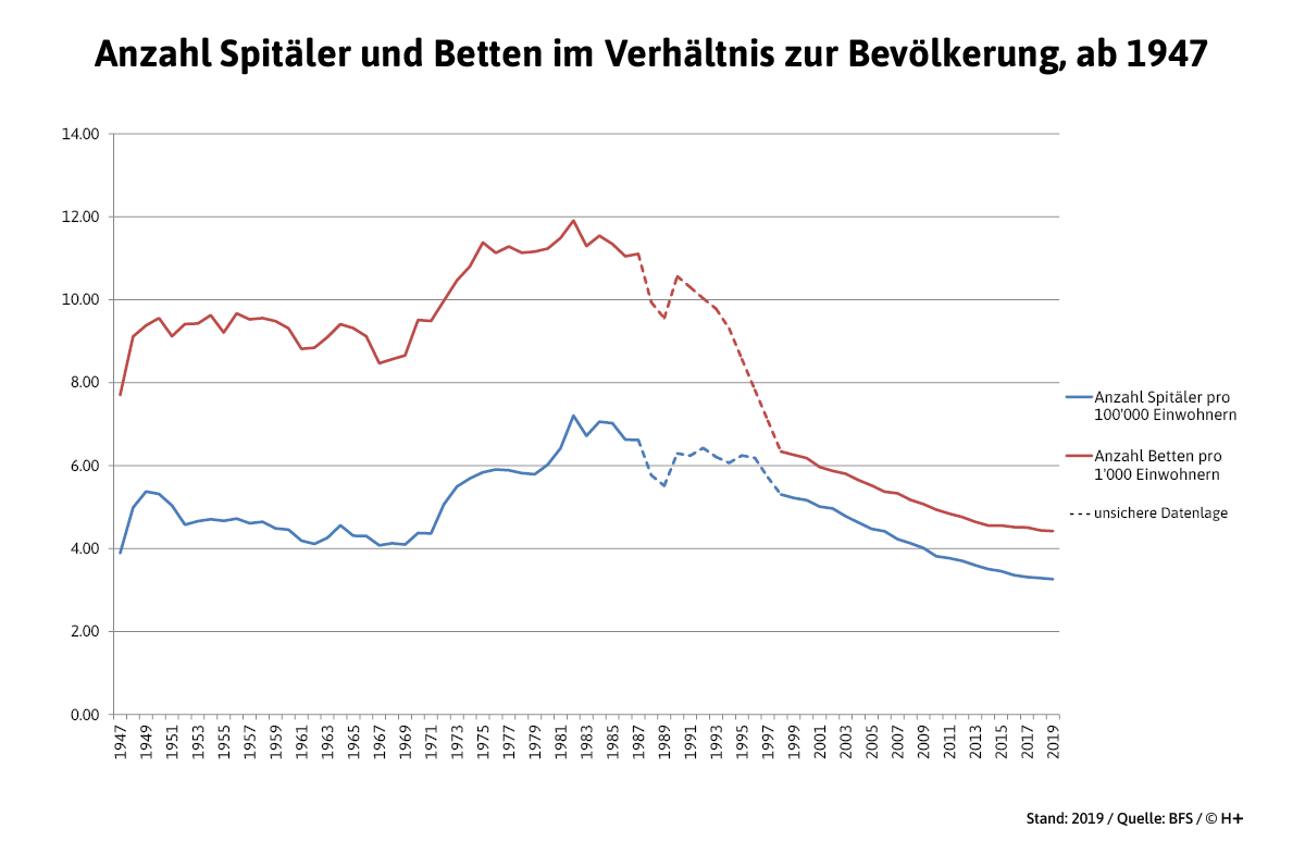 - Die Redimensionierungsphase begann in den 1980er Jahren und dauert bis heute an. 2019 zählte die Schweiz noch 3,25 Spitäler pro 100’000 und 4,4 Betten pro 1'000 Einwohner. Das bedeutet eine Reduktion im Vergleich zum Höhepunkt 1982 um 55% bei den Spitälern und 63% bei den Betten.