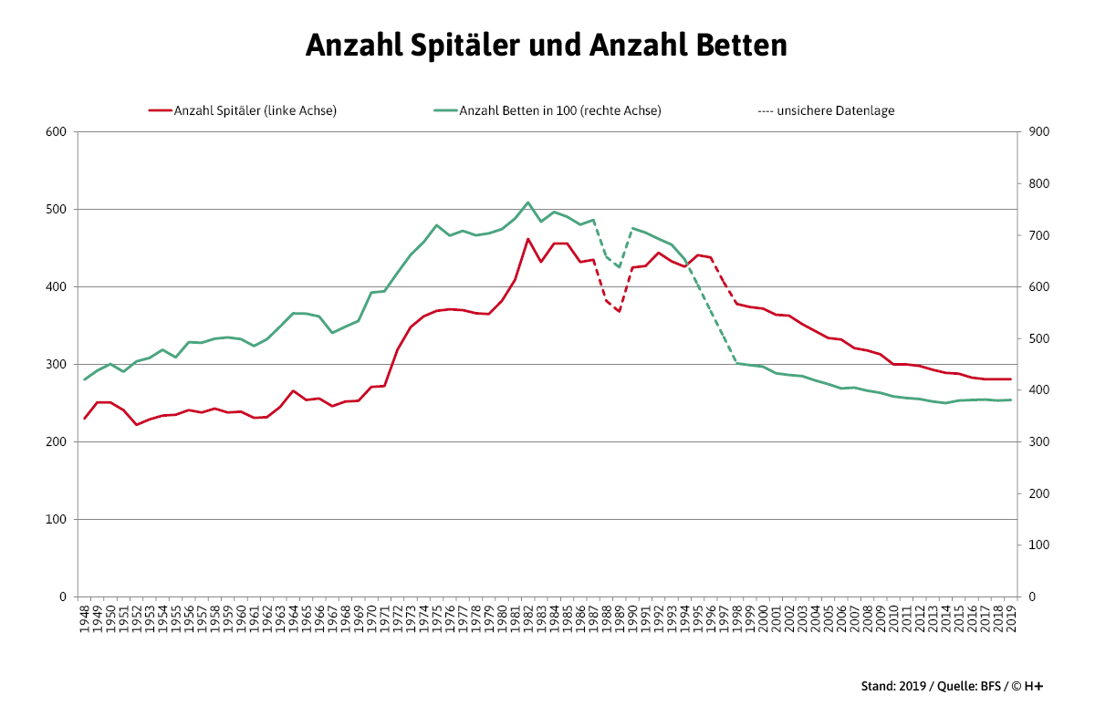 - Die Redimensionierungsphase begann in den 1980er Jahren und dauert bis heute an. 2019 zählte die Schweiz noch 281 Spitäler und rund 38‘000 Betten. Das bedeutet eine Reduktion im Vergleich zum Höhepunkt 1982 um 39% bei den Spitälern und 50% bei den Betten.