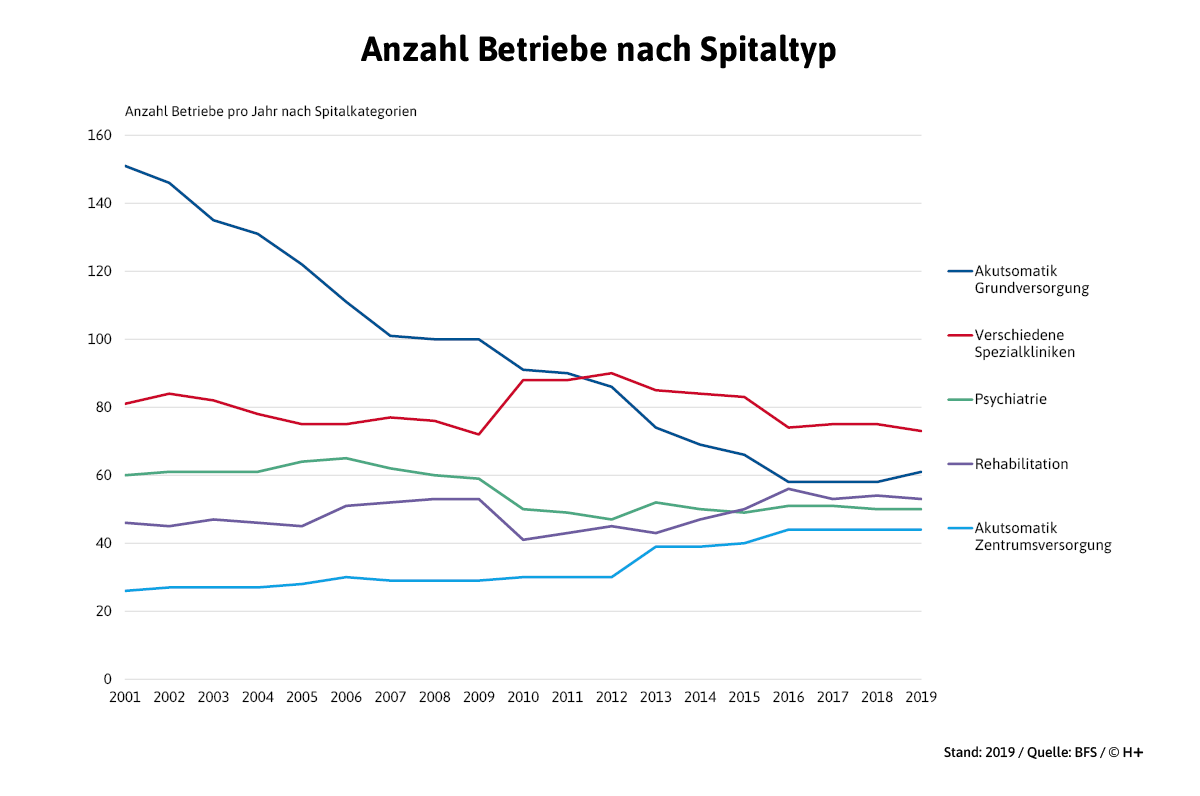 Die Gesamtzahl der Spitäler und Kliniken hat zwischen 2001 und 2019 um 23% abgenommen, von 364 im Jahr 2001 auf 281 im Jahr 2019. Die einst grösste Gruppe, die Spitäler der Grundversorgung, hat sich zahlenmässig um fast zwei Drittel verkleinert, von 151 auf 61 Betriebe (-62%). Hingegen ist die Zahl der Zentrumsspitäler im gleichen Zeitraum von 26 auf 44 Betriebe angestiegen, was einer Zunahme von über zwei Dritteln entspricht (+69%). Die gegenläufigen Tendenzen zeugen von einem Konzentrationsprozess (Fusionen, Spitalgruppenbildungen), der im Bereich Akutsomatik in den letzten zwei Jahrzehnten stattgefunden hat (siehe auch Hospitalisierungen nach Spitaltyp). Dabei sind auch diverse Kleinstspitäler geschlossen worden.