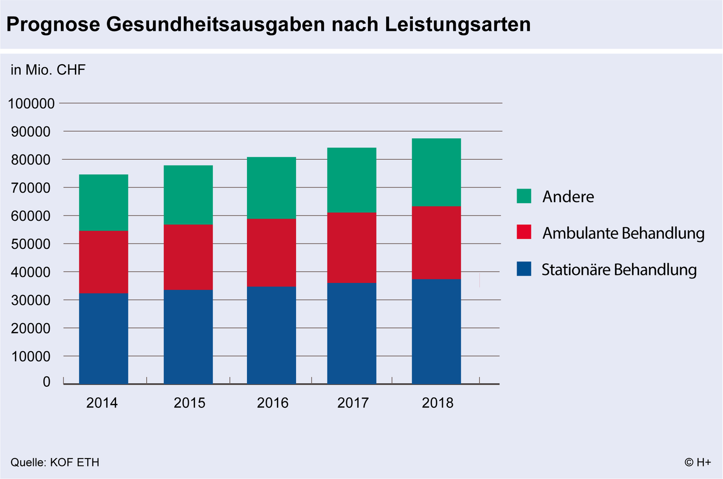 Eine nach wie vor dynamische Entwicklung lässt sich im dem Bereich «Ambulanten Kurativbehandlung» beobachten, was darauf hindeutet, dass die Verschiebung von Ausgaben von stationären in den ambulanten Bereich anhält. In der «Stationären Behandlung» sind Ausgaben für stationäre Kurativbehandlung, Rehabilitation und Langzeitpflege enthalten.