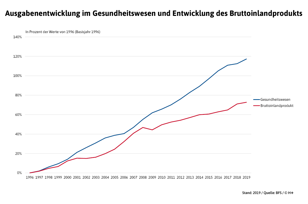 2019 betrugen die Kosten im Gesundheitswesen 82,1 Mrd. Franken. Das sind CHF 44,3 Mrd. oder 117% mehr als 1996, dem Jahr der Einführung des KVG. Das Bruttoinlandprodukt (BIP) ist im gleichen Zeitraum um CHF 306 Mrd. oder 73% gewachsen und betrug 2019 CHF 727 Mrd. Phasen der Divergenz (2000 bis 2004) und der Konvergenz (2004 bis 2007) wechselten einander zunächst ab. Seit 2008 wachsen die Kosten des Gesundheitswesens stets stärker an als das Bruttoinlandprodukt.
