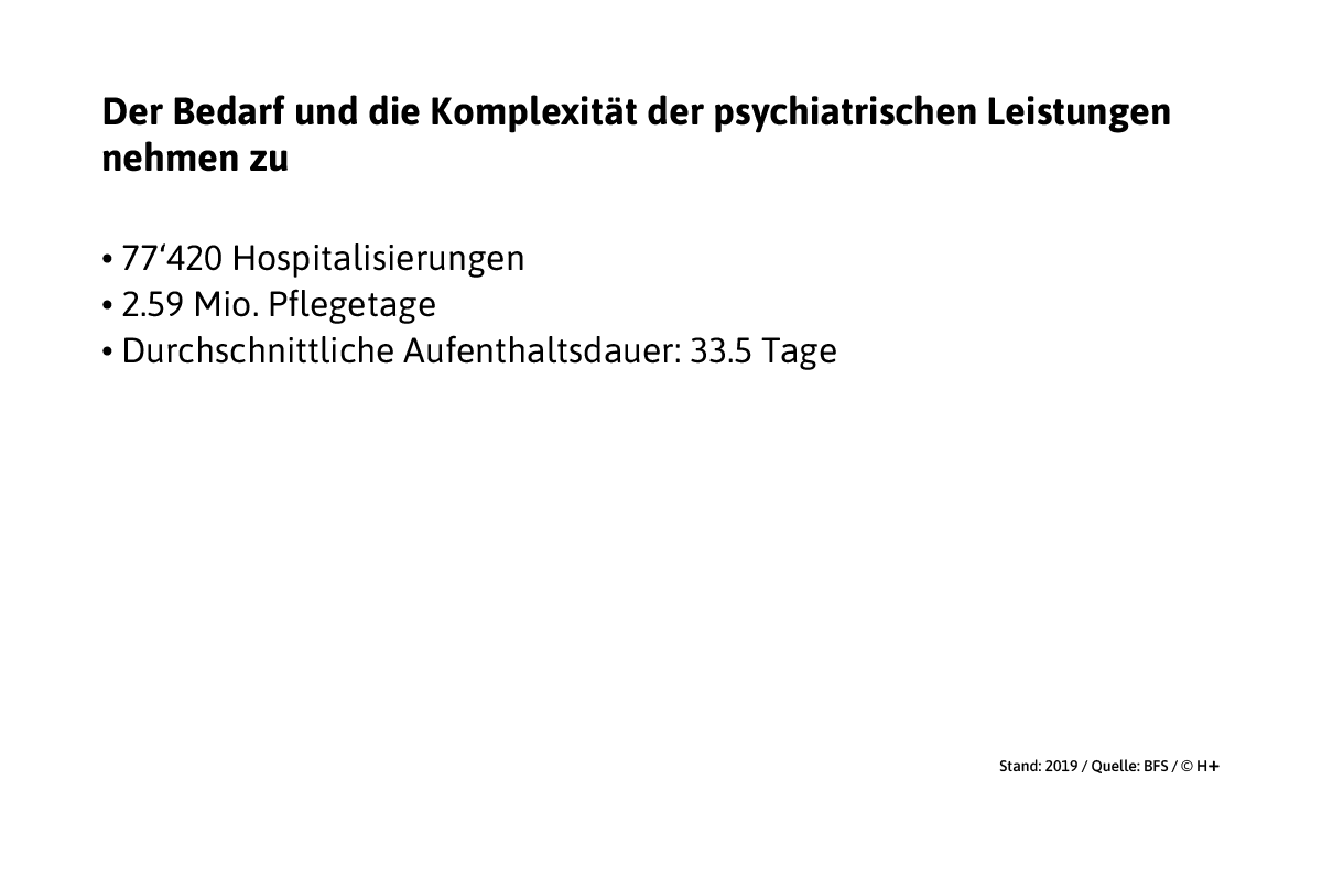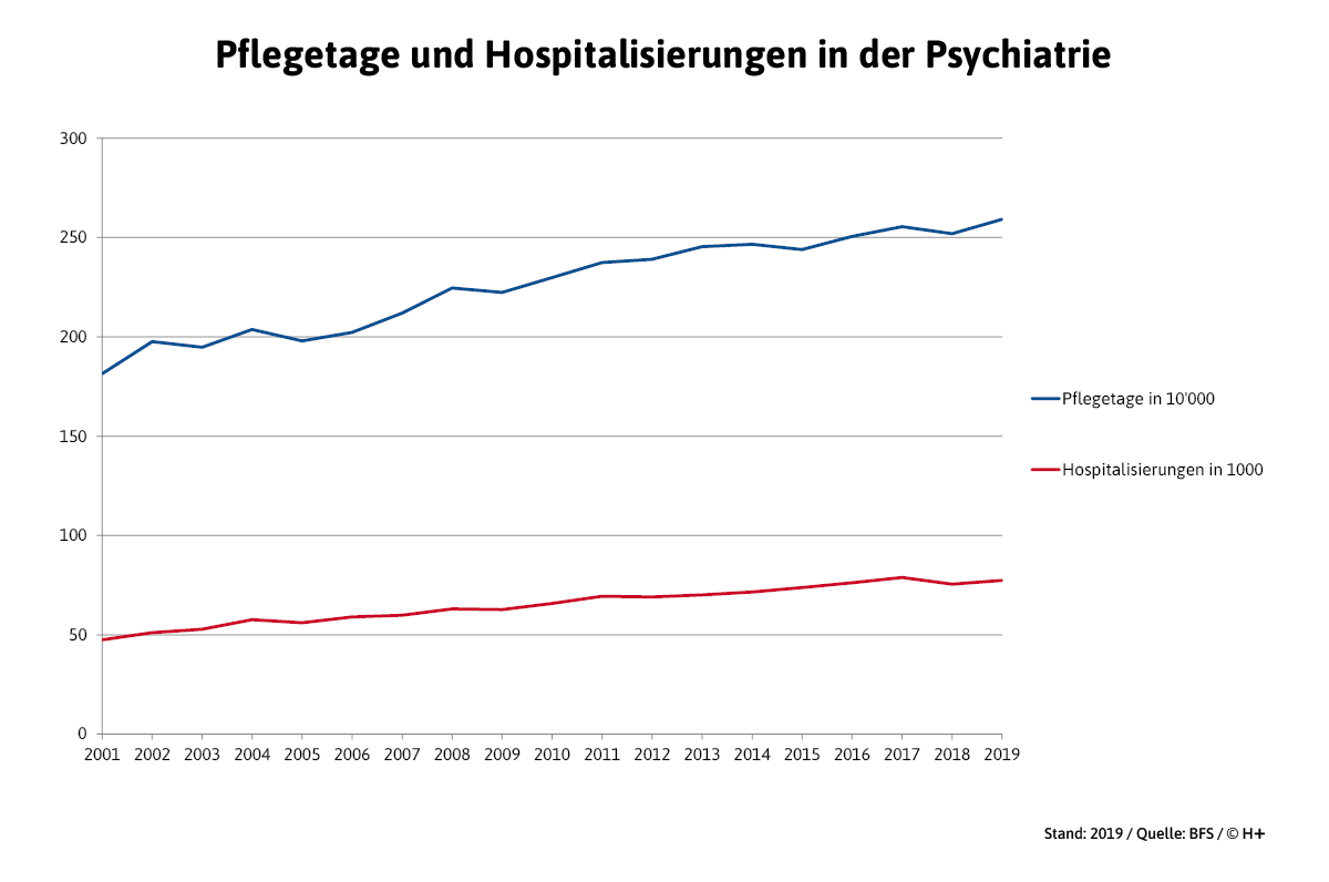 2019 verzeichneten die Spitäler und Kliniken 77‘420 psychiatrische Hospitalisierungen und erbrachten für diese 2‘591‘350 Pflegetage. Achtzehn Jahre zuvor, 2001, gab es in diesem Bereich 47‘457 Hospitalisierungen und 1‘814‘460 Pflegetage. Zwischen 2001 und 2019 nahm die Zahl der psychiatrischen Hospitalisierungen um 63% zu und diejenige der Pflegetage um 43%.
