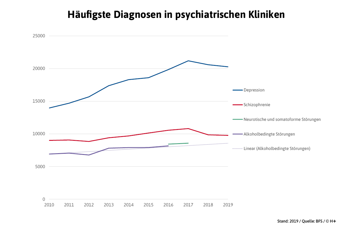 Die psychiatrischen Kliniken der Schweiz führten 2019 rund 61‘000 Behandlungen durch – fast ein Viertel (24%) mehr als 2010. Am häufigsten diagnostizierten sie im Beobachtungszeitraum Depression und andere krankhafte Stimmungsveränderungen (Fachbegriff: affektive Störungen). 2019 betraf dies 20’275 Hospitalisierungen, was einem Anteil von 33,2% entsprach. Die Zahl der Eintritte auf Grund von Depression nahm seit 2010 überdurchschnittlich zu, nämlich um 45%. Depression wird bei Frauen öfter diagnostiziert als bei Männern.