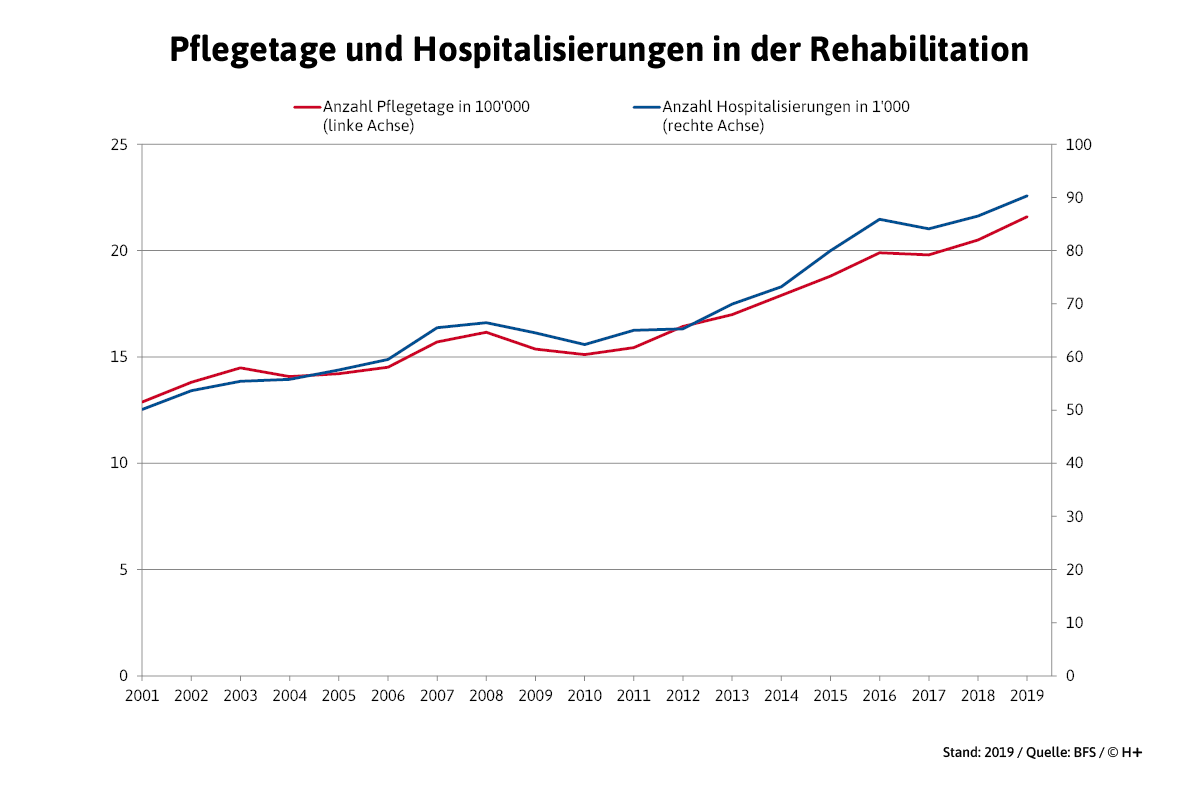 Zwischen 2001 und 2019 nahm die Zahl der Patientinnen und Patienten, die Rehabilitationsleistungen in Anspruch nahmen, um 40‘000 bzw. 80% zu. Im gleichen Zeitraum stieg die Anzahl Pflegetage um 870‘000 oder 68%. Zwischen 2008 und 2010 gingen die statistisch ausgewiesenen Zahlen sowohl für die Pflegetage als auch die Hospitalisierungen etwas zurück, um ab 2011 erneut anzusteigen. Insgesamt verläuft die Entwicklung bei beiden Kennzahlen nahezu gleichläufig, wenn auch mit leicht unterschiedlichem Steigerungsgrad.