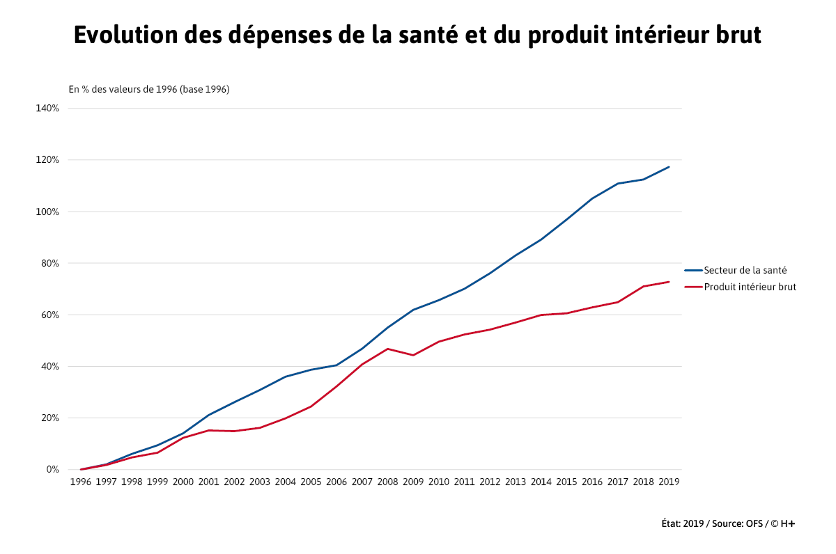 En 2019, les coûts de la santé se sont élevés à CHF 82,1 Mrds, soit CHF 44,3 Mrds ou 117% de plus qu’en 1996, l’année de l’introduction de la LAMal. Durant la même période, le produit intérieur brut (PIB) a crû de CHF 306 Mrds ou 73%. Il se montait en 2019 à CHF 727 Mrds. Les phases de divergences (de 2000 à 2004) et de convergence (2004 à 2007) ont alterné pour l’instant. Depuis 2008, les coûts de la santé ont augmenté toujours plus fortement que le produit intérieur brut.
