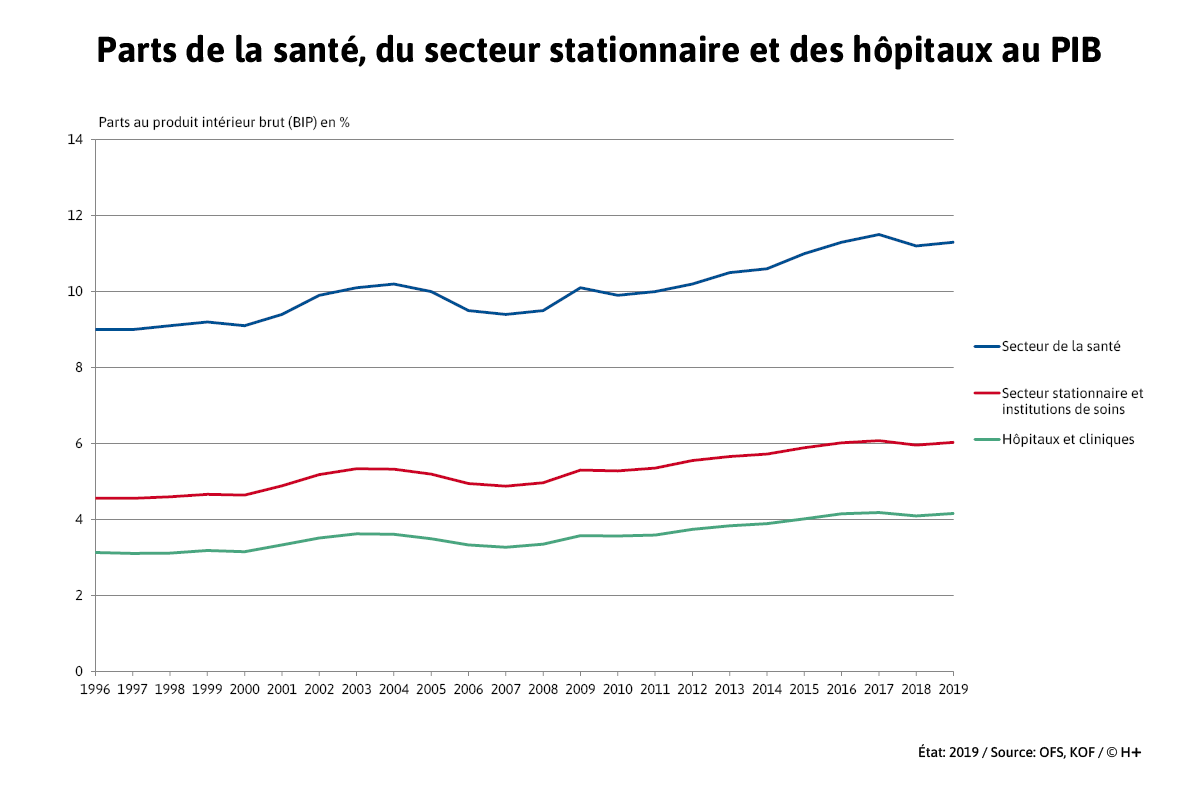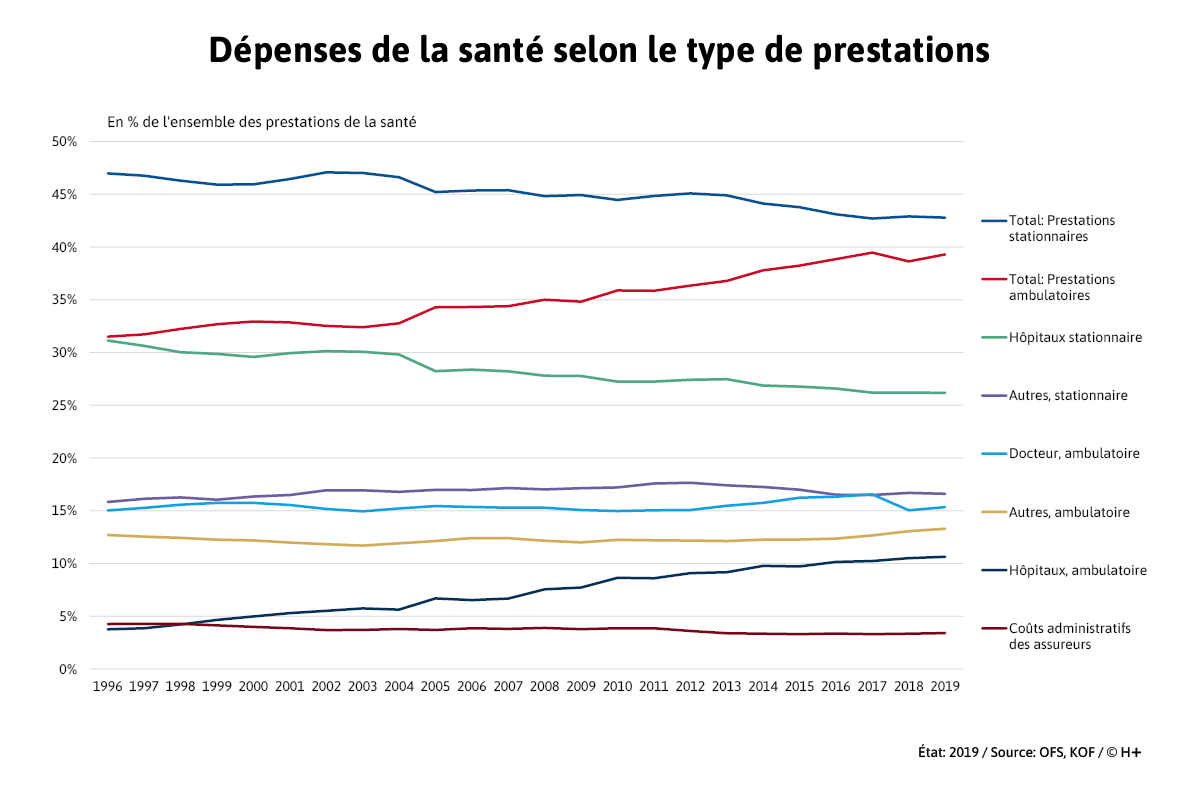 En 2019, les hôpitaux et les cliniques ont dispensé en ambulatoire des prestations pour un montant de CHF 8,7 Mrds et en stationnaire pour CHF 21,5 Mrds. En d’autres termes, trois cinquièmes de toutes les prestations stationnaires et plus d’un quart des prestations ambulatoires sont fournies par les hôpitaux. La part des prestations stationnaires des hôpitaux par rapport au total des coûts de la santé est à la baisse depuis 1996. Alors que dans le domaine ambulatoire des hôpitaux, une hausse continuelle s’observe.