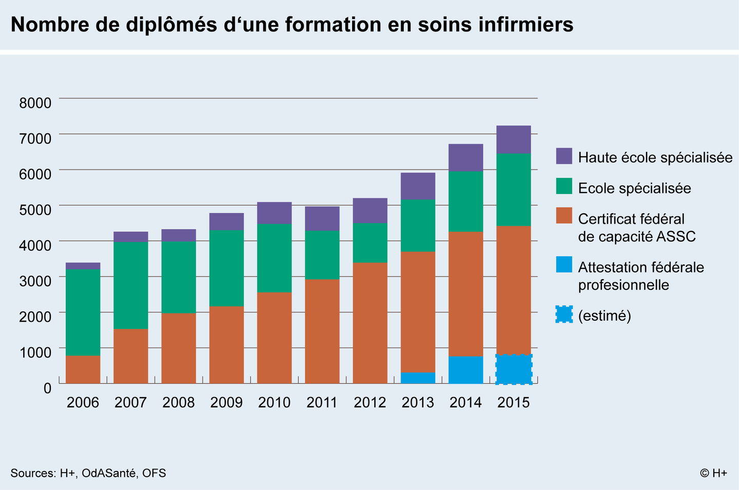 Le nombre de diplômes dans le domaine des soins infirmiers a plus que doublé entre 2006 et 2015 (+115%), passant de 3’390 à 7’275. Le groupe principal est constitué par les diplômes d’assistant en soins et santé communautaire (ASSC): on en dénombrait 3'650 en 2015 (50%). Suivent les diplômes des écoles supérieures (ES) avec 2’050 (28%), puis ceux d’aide en soins et accompagnement (AFP), dont le nombre est estimé à 790 (11%), et enfin les diplômes HES avec 785 (11%). Les diplômes d’ASSC ont affiché aussi la plus grande progression (+370%), devant ceux des HES (+320%).