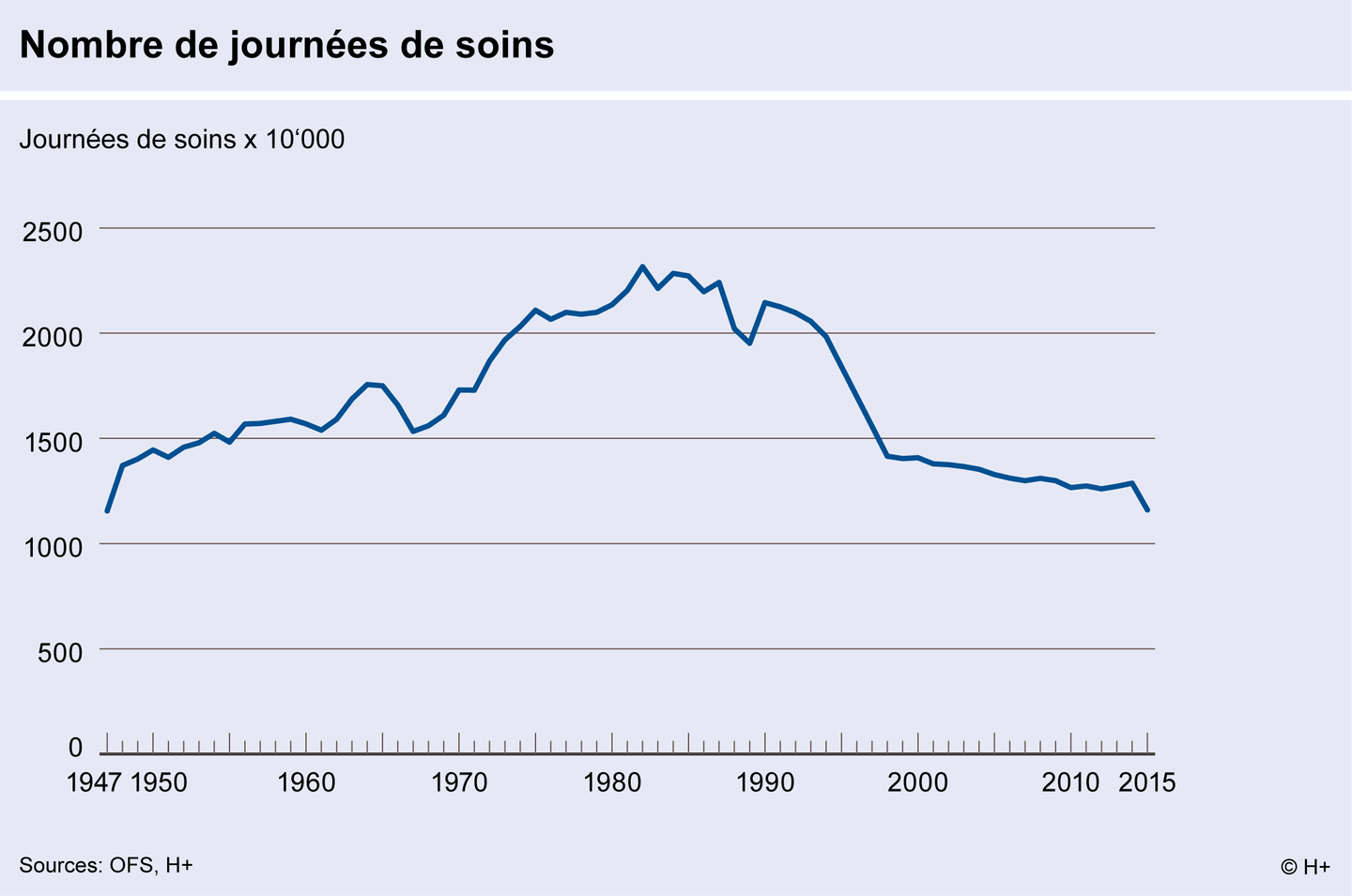 L’évolution des journées de soins depuis la fin de la Deuxième guerre mondiale peut être décrite comme suit: entre 1947 et 1982, le nombre de journées de soins n’a cessé d’augmenter et a doublé, passant de 11,6 à 23,2 Mios. Cette phase a été suivie de trois décennies de décroissance environ. Le nombre de journées de soins a été réduit à 11,6 Mios jusqu’à 2015, soit pratiquement au début des années 40. Par rapport à 1982, la diminution atteint 50%.