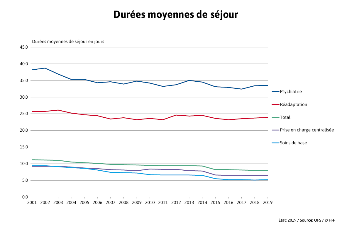 La durée moyenne de séjour dans les hôpitaux et cliniques suisses a atteint 8,0 jours en 2019. Soit un raccourcissement de 3,2 jours, ou 29%, par rapport à 2001. On observe cependant de fortes différences selon les secteurs. La durée moyenne est la plus courte (5,2 jours) dans les soins somatiques aigus (soins de base) et la plus longue (33,5 jours) en psychiatrie. En réadaptation, cette durée est de 23,9 jours. Tous les secteurs ont enregistré une réduction entre 2001 et 2019 (soins aigus de base -4,2 jours, soins aigus avec prise en charge centralisée -2,8 jours, réadaptation -1,8 jours et psychiatrie -4,7 jours).