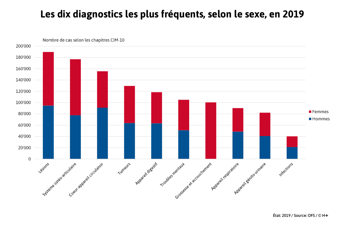 La grossesse et l’accouchement constituent le motif d’hospitalisation le plus fréquent chez les femmes (100‘387 cas), devant les atteintes au système ostéo-articulaire et musculaire. Chez les hommes, les diagnostics de maladies cardio-vasculaires constituent le groupe le plus fréquent, suivi par les lésions.
