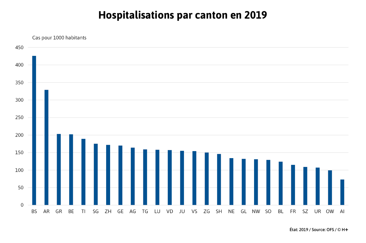 En moyenne suisse, 171 hospitalisations au total ont été enregistrées pour 1000 habitants en 2019. Bâle-Ville présente le taux le plus élevé avec 426 cas pour mille, suivi par Appenzell Rhodes-Extérieures (329) et les Grisons (203). Les cantons assumant une fonction de centre et dotés d’une infrastructure diversifiée et spécialisée traitent une grande quantité de cas, provenant également de l’extérieur. Ceux qui se trouvent plutôt en périphérie peuvent eux aussi exercer un certain pouvoir d’attraction sur les patients extra-cantonaux ou vivant à l’étranger. Appenzell Rhodes-Extérieures, dont l’offre en cliniques privées est grande, en est le meilleur exemple. Dans les Grisons, en revanche, le tourisme des sports d’hiver contribue au fort taux de cas.