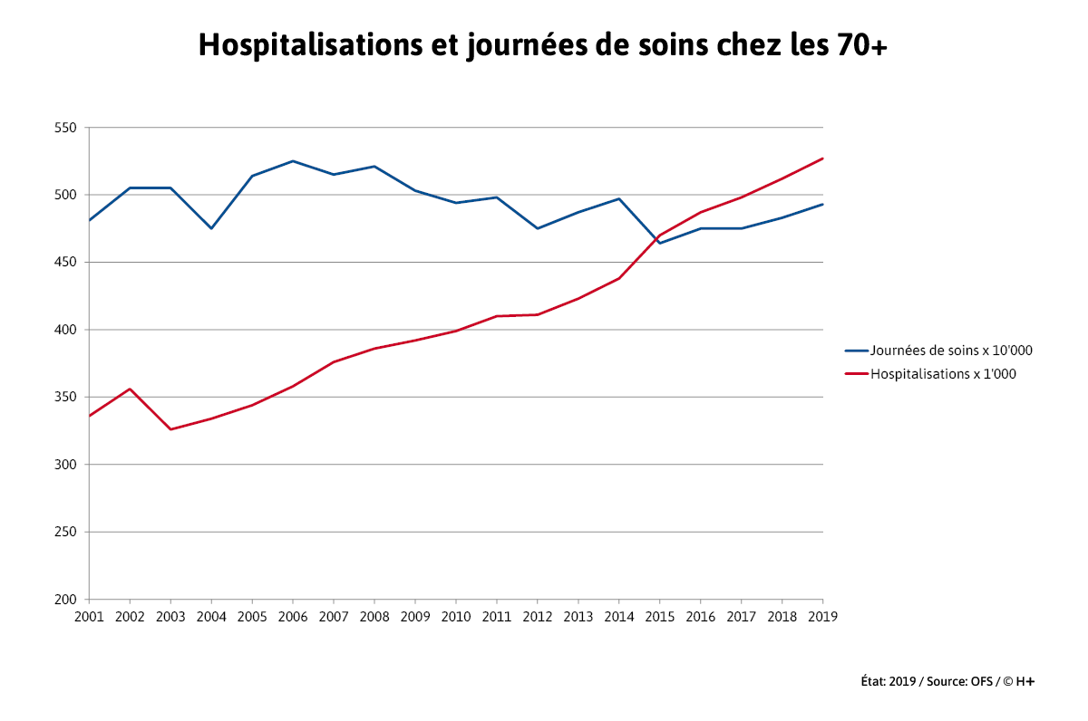 En 2019, 0,5 Mio d’hospitalisations et 5,0 Mios de journées de soins ont été enregistré chez les personnes âgées de 70 ans et plus. Cela représentait 42% du total des journées de soins et 36% de l‘ensemble des hospitalisations en Suisse.