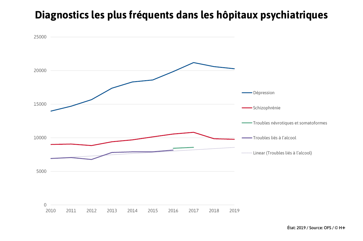 Ces constats se rapportent aux institutions psychiatriques. Les patients psychiatriques examinés et traités par les hôpitaux de soins aigus et d’autres fournisseurs de prestations ne figurent pas dans cette statistique.