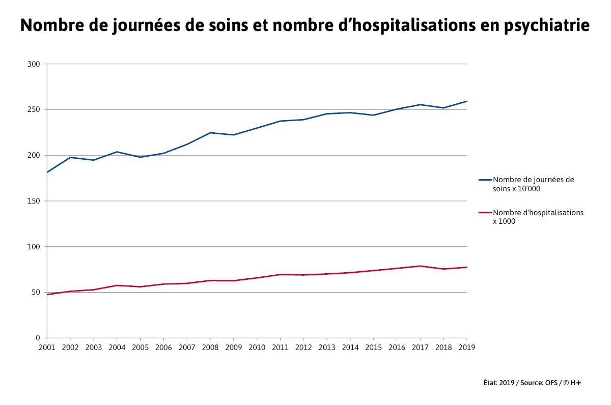 En 2019, les hôpitaux et les cliniques ont enregistré 77'420 hospitalisations en psychiatrie pour 2‘591‘350 journées de soins. Dix-huit ans auparavant, en 2001, le nombre des hospitalisations était de 47’457 et celui des journées de soins de 1'814’460. Entre 2001 et 2019, les hospitalisations ont augmenté de 63% et les journées de soins de 43%.