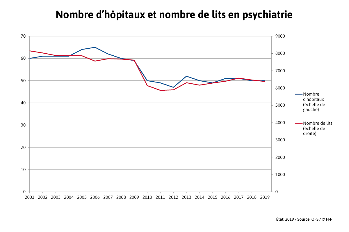 Les fluctuations quantitatives sont liées à un changement dans la manière de décompter les hôpitaux par l’Office fédéral de la statistique. Depuis 2010, les institutions psychiatriques intégrées à un réseau hospitalier ne sont plus comptées comme des entités séparées et leurs lits ne sont plus répertoriés sous Psychiatrie dans la Statistique des hôpitaux. On ne peut donc pas parler de réductions ou de suppressions dans le secteur de la psychiatrie, mais plutôt d’une tendance à l’intégration des hôpitaux psychiatriques dans les groupements d‘hôpitaux et de cliniques.