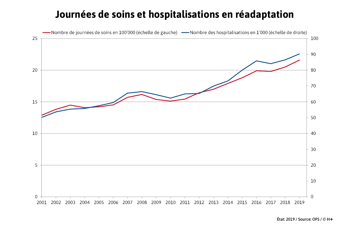 Entre 2001 et 2019, le nombre de patients ayant bénéficié de prestations de réadaptation a augmenté de 80% (+40’000). Dans le même intervalle, le nombre de journées de soins a crû de 68% (+870'000). Entre 2008 et 2010, les données statistiques indiquent un certain fléchissement, tant des journées de soins que des hospitalisations, avant de repartir à nouveau à la hausse dès 2011. Dans l’ensemble, les deux indicateurs ont quasiment évolué en parallèle, même si le taux de croissance diffère légèrement.