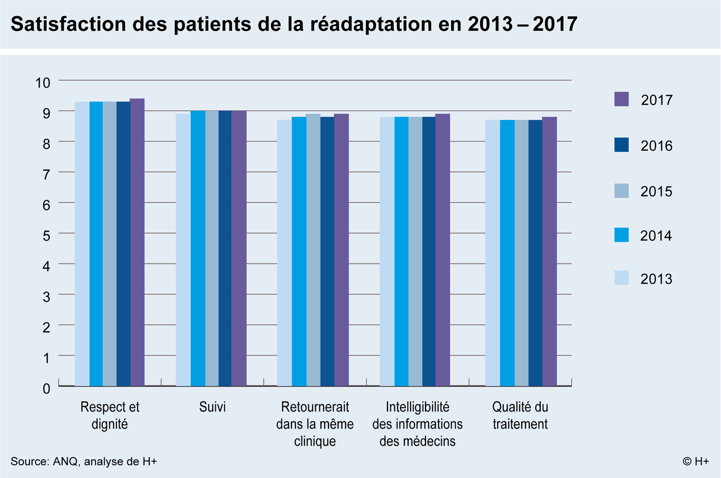 Les patientes et les patients sont très satisfaits des cliniques suisses de réadaptation. Tel sont les résultats des enquêtes nationales auprès des patients menées ces cinq dernières années par l’Association nationale pour le développement de la qualité dans les hôpitaux et les cliniques (ANQ). Les patients ont attribué des notes de 0 à 10 en réponse à cinq questions. Avec des valeurs moyennes entre 8,8 et 9,4, les cliniques de réadaptation ont toujours été bien notées.