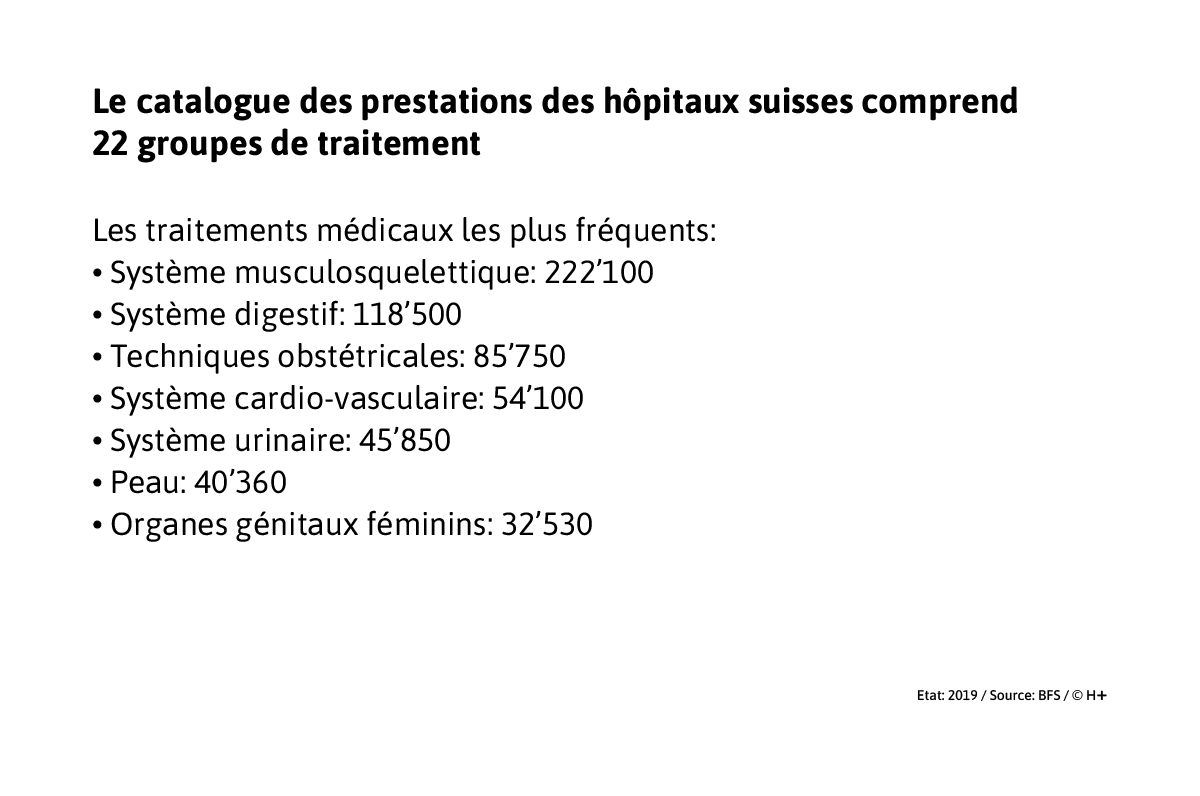 Environ 20% des traitements médicaux à l’hôpital concernent des opérations aux organes musculosquelettiques, tels que la colonne vertébrale, les articulations, les muscles, etc. (chapitre 14 de la Classification suisse des interventions chirurgicales CHOP). Ce groupe, qui compte 222’100 cas, est de loin le plus important, suivi par les opérations du système digestif (118’500 cas, chapitre 9) et la chirurgie obstétrique (85’750 cas, chapitre 13).