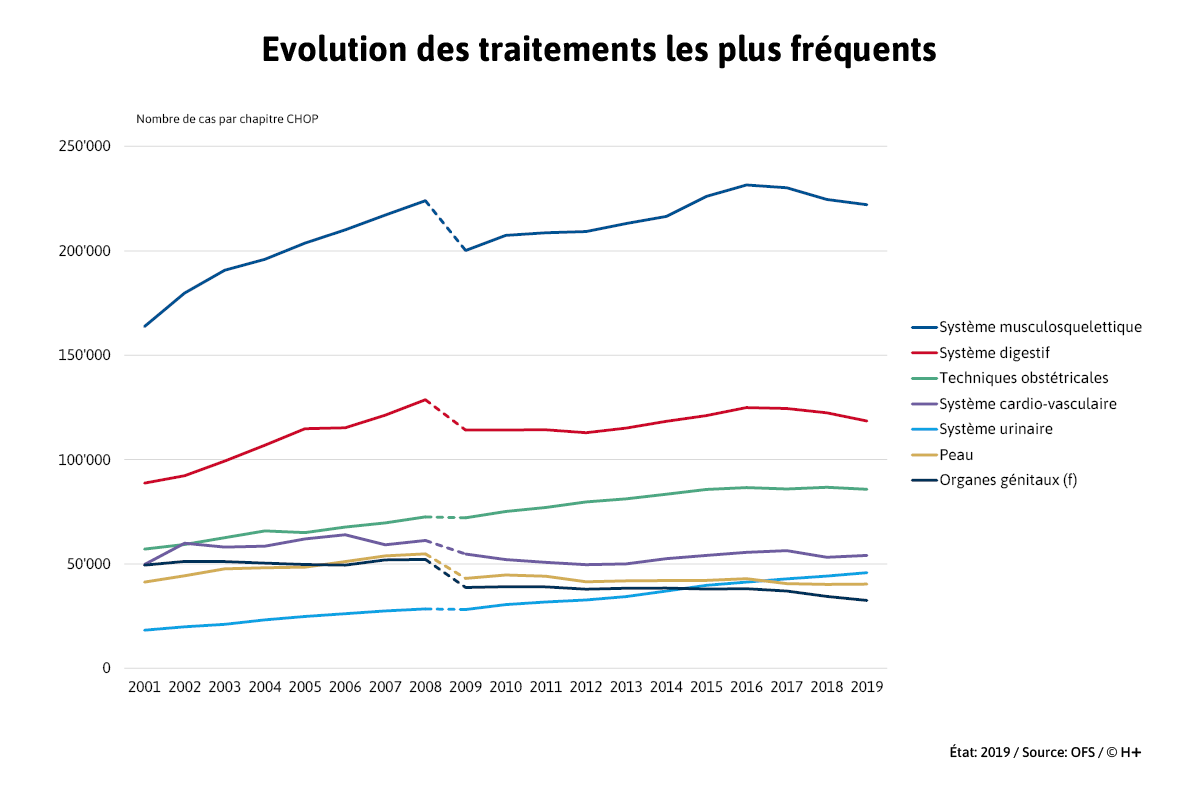 Tous les types de traitements mentionnés ont vu leurs nombres de cas notablement augmenter entre 2001 et 2019. La hausse est de 36% pour le système musculosquelettique, de 34% pour le système digestif et de 50% dans le cas de la chirurgie obstétrique. La principale progression concerne les opérations du système urinaire (chapitre 10), passées de 18'250 à 45'850 (+151%). Après avoir été en baisse par le passé, les opérations du système cardio-vasculaire sont en hausse depuis 2013 (chapitre 7). Les opérations de la peau sont stables (chapitre 15) et celles qui concernent les organes génitaux féminins (chapitre 12) vont en diminuant.