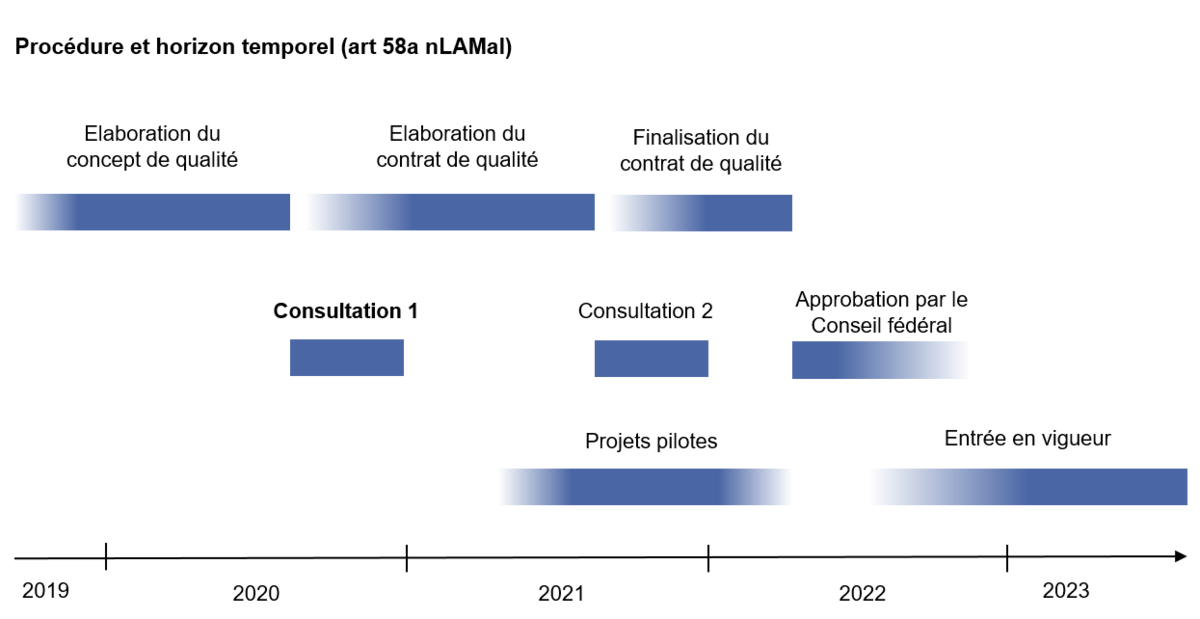 Avec la révision de la loi sur l’assurance-maladie (LAMal) Renforcement de la qualité et de l’économicité, H+ est tenue de signer à l’avenir des contrats de qualité avec les fédérations d’assureurs maladie santésuisse et curafutura (art. 58a nLAMal). L’an dernier, H+ a donc élaboré un concept de développement de la qualité en collaboration avec les fédérations d’assureurs, dont le contenu, selon les prescriptions des autorités, doit servir de base aux contrats de qualité (lire également eFlash 05/2020). Ceux-ci devront être soumis au Conseil fédéral pour approbation d’ici au deuxième trimestre 2022.