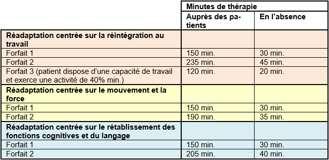 L’ancienne structure opérait une différence entre la réadaptation neurologique ambulatoire et la réadaptation musculosquelettique ambulatoire. Lors des négociations, les partenaires tarifaires ont décidé de placer au premier plan l’objectif de réadaptation. Au sein des catégories, une différenciation est faite dans l’intensité de la réadaptation ambulatoire. La nouvelle nomenclature se présente comme suit: