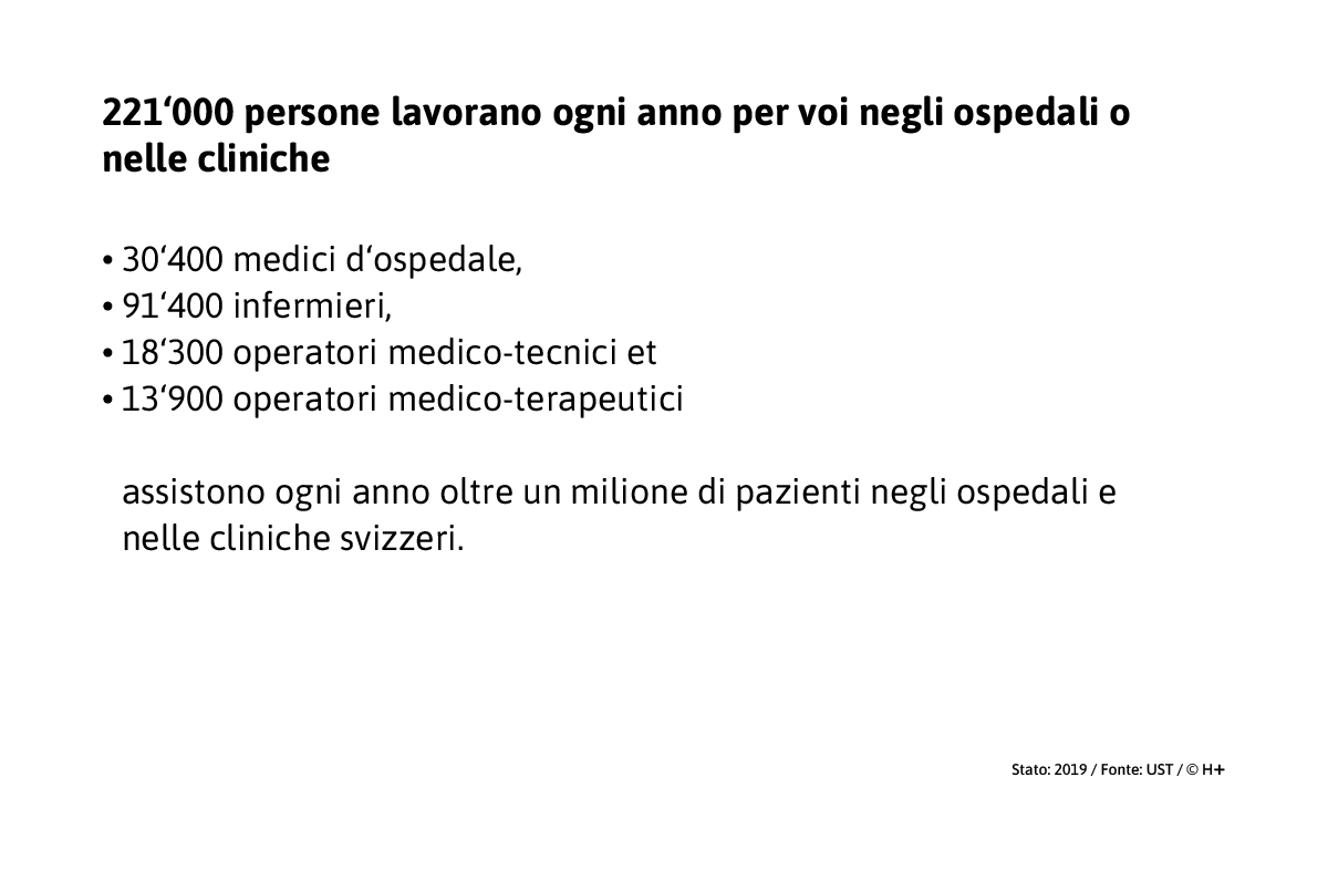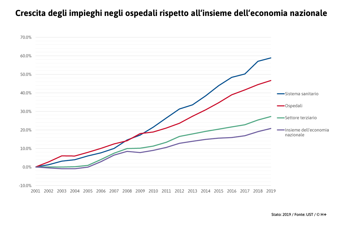 Il sistema sanitario, in particolare il settore ospedaliero, crea un gran numero di posti di lavoro. Nel 2019 negli ospedali e nelle cliniche 171’000 posti di lavoro erano occupati in equivalenti a tempo pieno, vale a dire 54’500 posti in più rispetto al 2001. Ciò corrisponde a un aumento del 47% sull'arco di diciotto anni. Nel confronto con l'insieme dell'economia nazionale (settore terziario e insieme dell'economia nazionale) lo sviluppo degli impieghi nel sistema sanitario presenta un andamento dinamico superiore alla media.