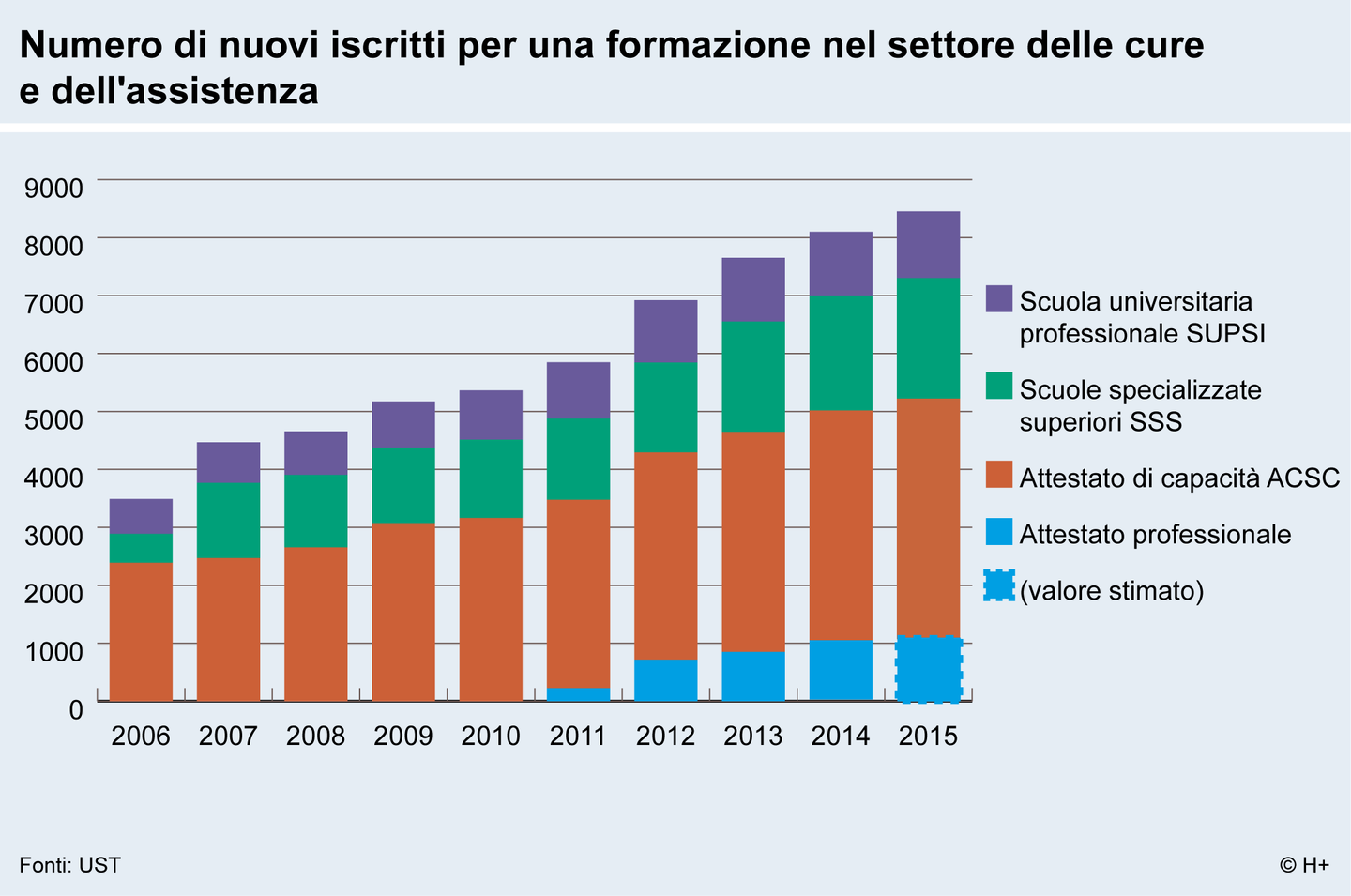 Il numero di nuovi studenti della formazione in cure infermieristiche tra il 2006 e il 2015 è aumentato di due volte e mezzo, da 3'489 a 8'500 unità (+144%). Il gruppo maggiore è costituito dagli Operatori sociosanitari (OSS) con 4'150 nuovi iscritti nel 2015 (+74% rispetto al 2006) e una quota pari al 49% del totale dei nuovi iscritti. Seguono la scuola specializzata superiore in cure infermieristiche (SSS) con 2'100 iscritti (quota del 25%) e la scuola universitaria professionale cure infermieristiche (SUP) con 1'150 nuovi iscritti (il 14%). Il numero di iscritti alla SSS rispetto al 2006 è più che quadruplicato, quello della SUP è quasi raddoppiato.