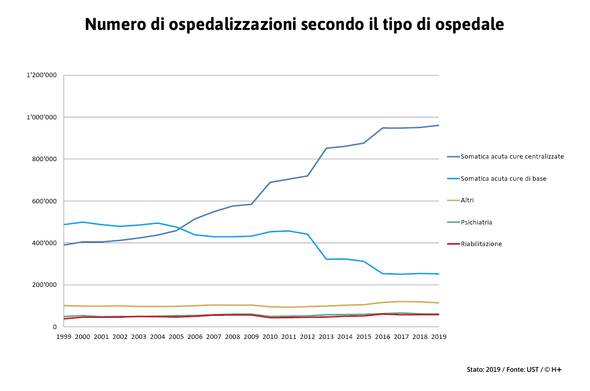 L'evoluzione in controtendenza per quanto riguarda le ospedalizzazioni è coerente con lo sviluppo dei dati di struttura corrispondenti (cfr. tipi di ospedale). Tale sviluppo è tra gli altri il risultato di fusioni (formazione di gruppi ospedalieri) che hanno portato talune strutture delle cure di base a diventare strutture delle cure centralizzate.