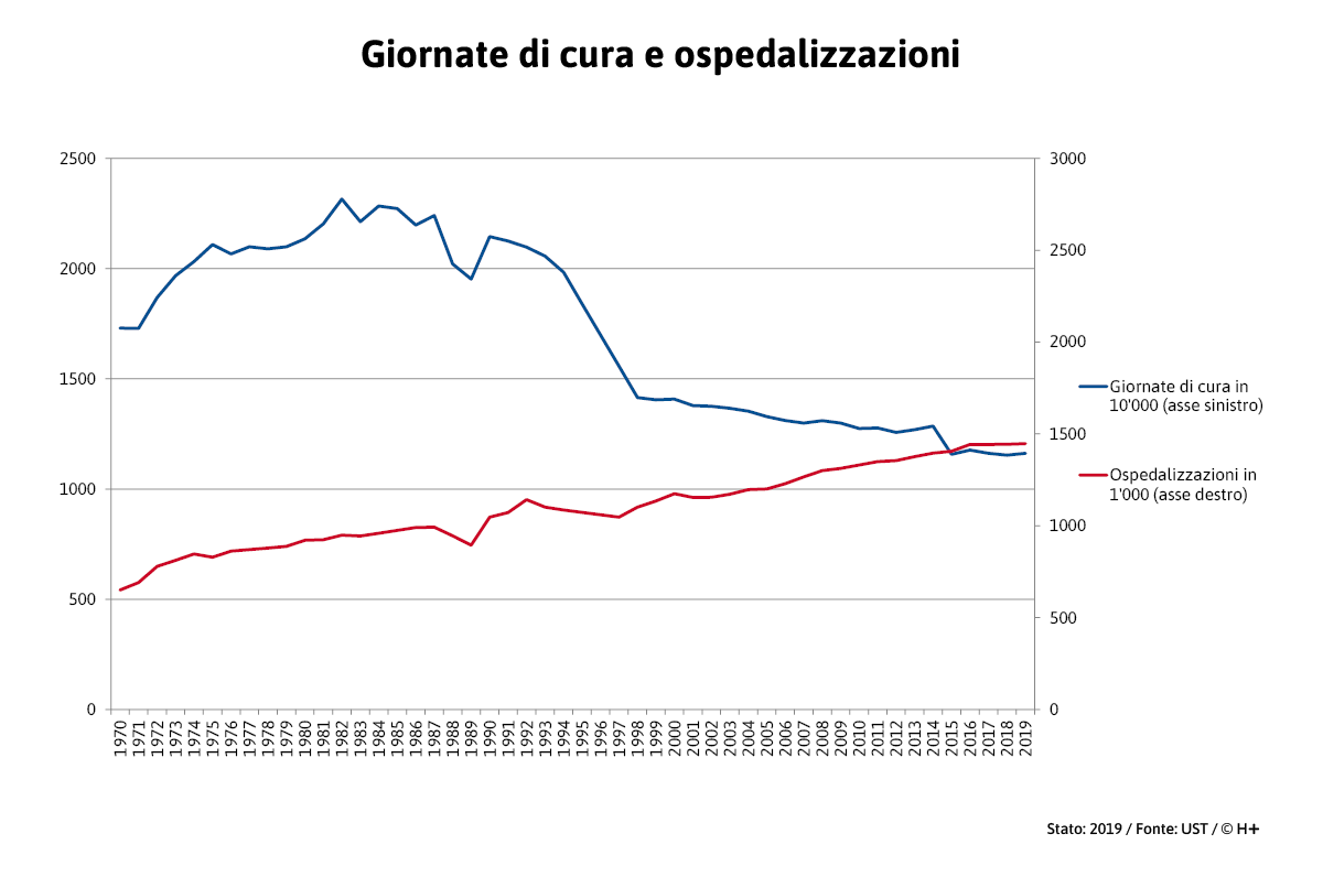 Dal 1982 le ospedalizzazioni e le giornate di cura presentano una tendenza contraria. Il numero di ospedalizzazioni tende ad aumentare - da 0,65 milioni (stato 1970) a 0,95 milioni (stato 1982), 1,10 milioni (1998) e 1,45 milioni (2019). L'aumento tra il 1970 e il 1982 è stato del 46%; tra il 1982 e il 1998 il numero di ospedalizzazioni è ulteriormente cresciuto del 16% e tra il 1998 e il 2019 nuovamente del 31%.