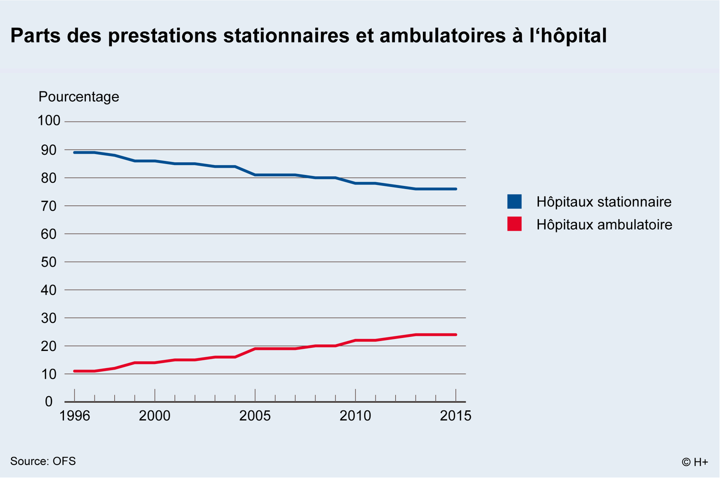 19 anni dopo, nel 2015, gli ospedali fornivano sempre ancora la maggior parte delle proprie prestazioni in modo stazionario, ma il rapporto con le prestazioni ospedaliere ambulatoriali è sceso a 76:24. Dei complessivi 25,9 miliardi di franchi 19,6 miliardi erano prestazioni ospedaliere e 6,3 miliardi prestazioni ambulatoriali.