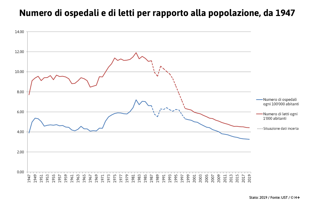 - La fase di ridimensionamento è iniziata negli anni 1980, ed è tuttora in corso. Nel 2019 la Svizzera contava ancora 3,25 ospedali ogni 100’000 e 4,4 letti ogni 1'000 abitanti. Ciò significa una riduzione del 55% per quanto riguarda gli ospedali e del 63% per i letti, rispetto al culmine del 1982.
