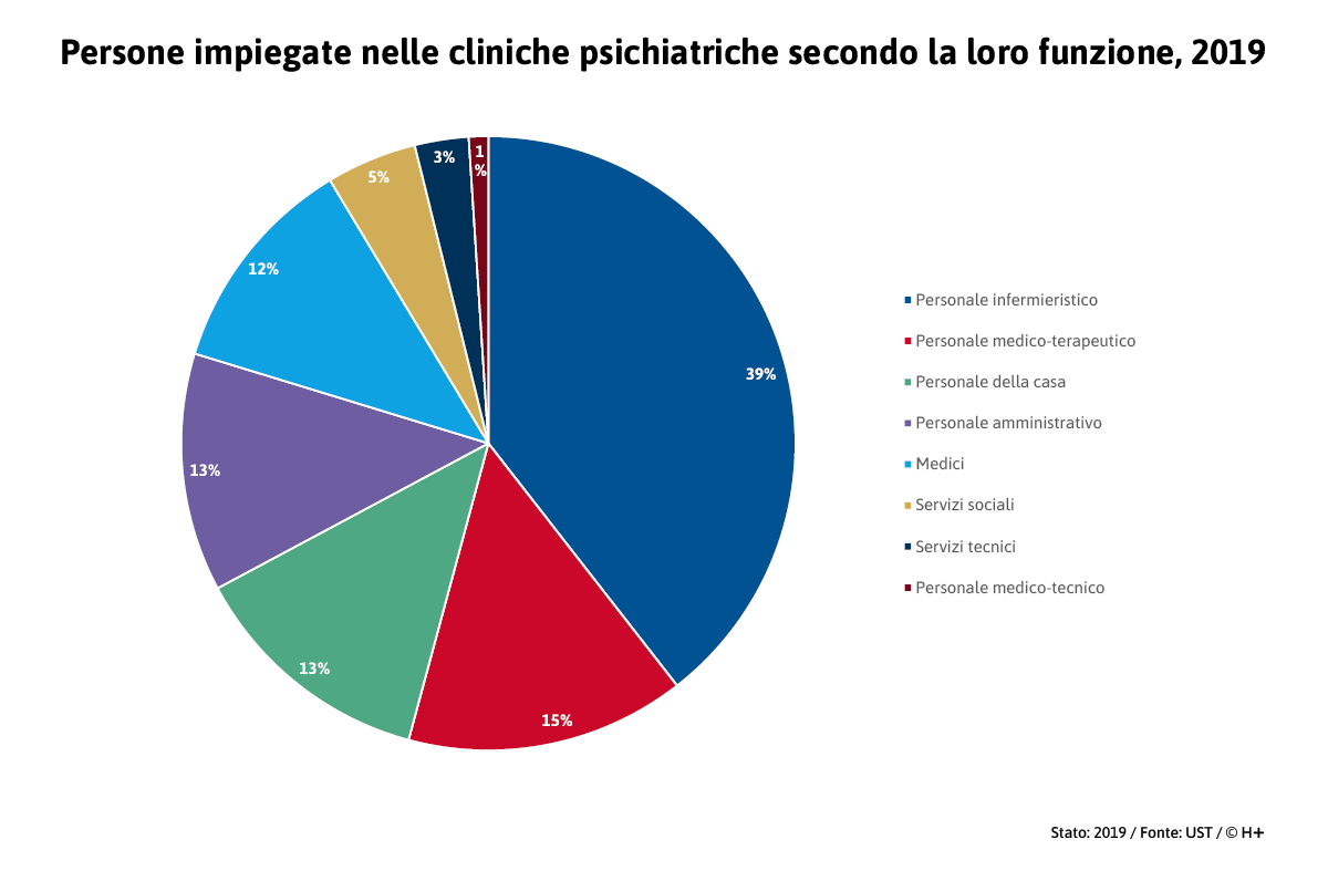Nel 2019 le cliniche psichiatriche contavano 15’823 persone impiegate in equivalenti a tempo pieno (ETP). Si tratta del 9,3% di tutte le persone impiegate nel sistema sanitario. Il gruppo maggiore è formato dal personale infermieristico con 6’245 ETP (il 39% di tutte le persone impiegate nelle cliniche psichiatriche), seguito dal personale medico-terapeutico con 2’329 ETP (il 15%), il personale di economia domestica con 2'056 ETP (il 13%), il personale amministrativo con 1'984 ETP (il 13%) e i medici con 1‘844 ETP (il 12%). Le quote parti di queste categorie corrispondono circa a quelle dell'intero settore ospedaliero, fatta eccezione per il personale medico-terapeutico, la cui quota parte in psichiatria si situa chiaramente al di sopra della media (il 15%) rispetto al settore complessivo (6%) (cfr. Personale ospedaliero secondo categorie professionali).