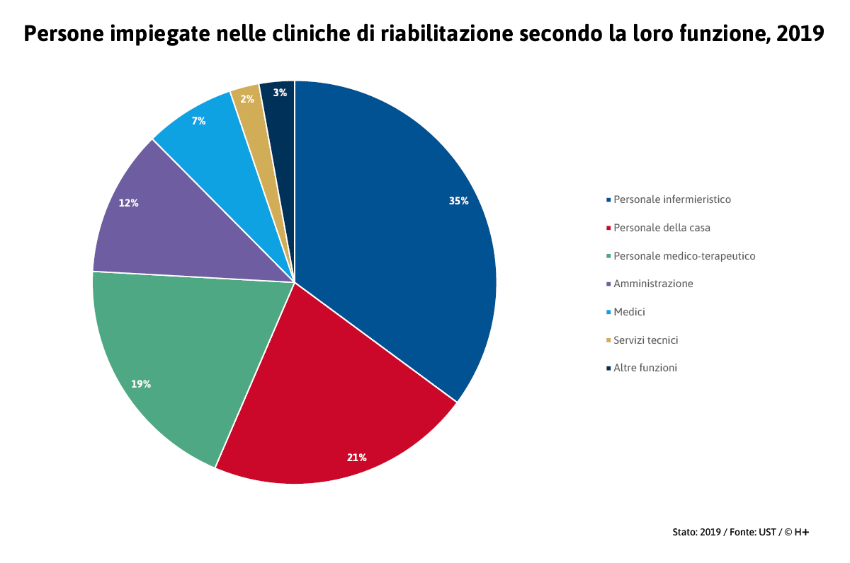 Nel 2019 le cliniche di riabilitazione contavano 9’106 persone impiegate in equivalenti a tempo pieno (ETP). Si tratta del 5,3% di tutte le persone impiegate nel sistema sanitario. Il gruppo maggiore è costituito dal personale infermieristico con 3’199 ETP (il 35% di tutte le persone impiegate nelle cliniche di riabilitazione), seguito dal personale di economia domestica e dal personale medico-terapeutico con rispettivamente 1‘941 (21%) e 1‘769 ETP (19% del totale). Il personale infermieristico e quello medico-terapeutico assieme costituiscono oltre la metà delle persone impiegate nelle cliniche di riabilitazione.
