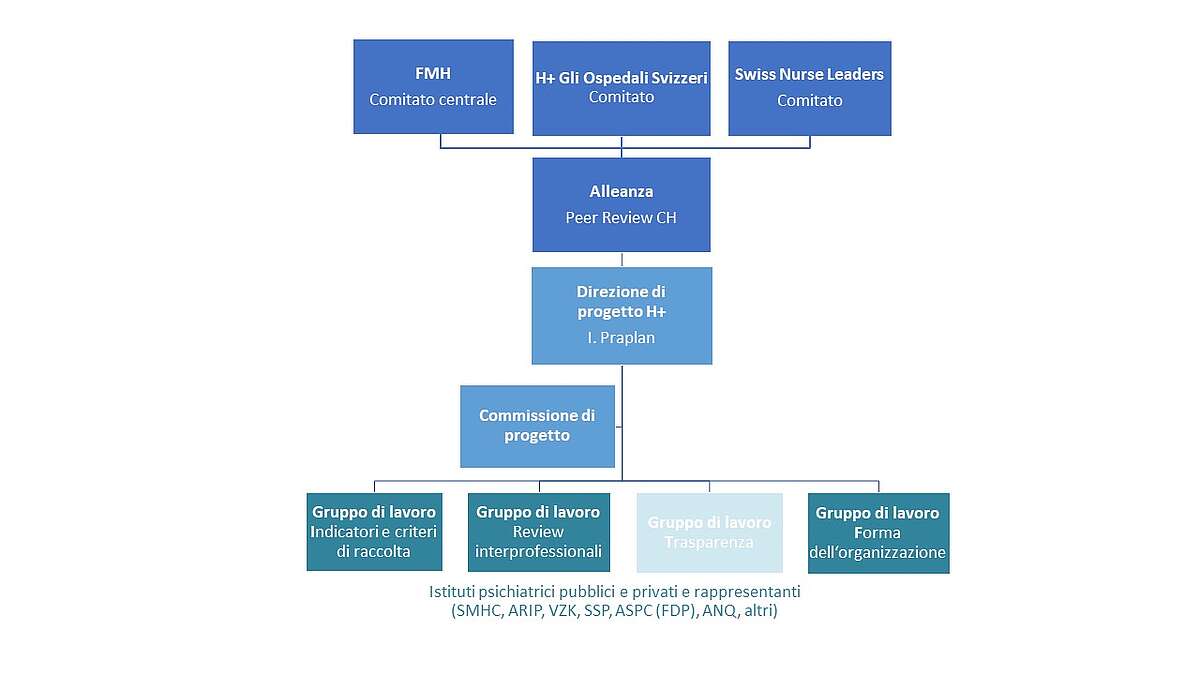 Nel 2018, sotto l’egida dell’alleanza Peer Review CH (FMH, H+, Swiss Nurse Leaders) è stato avviato il progetto per la creazione di una procedura di Review interprofessionale per il settore specializzato della psichiatria. Determinante è stato il Peer Review standardizzato dell’Initiative Qualitätsmedizin (IQM) nella somatica acuta. Esso gode di un elevato grado di accettazione da parte dei dirigenti e degli operatori specializzati degli ospedali e delle cliniche. Per il settore specializzato della psichiatria non esiste una procedura paragonabile. In tre dei quattro gruppi di lavoro previsti degli esperti provenienti dal settore medico, delle cure e terapeutico elaborano proposte di attuazione per il settore specializzato psichiatria.